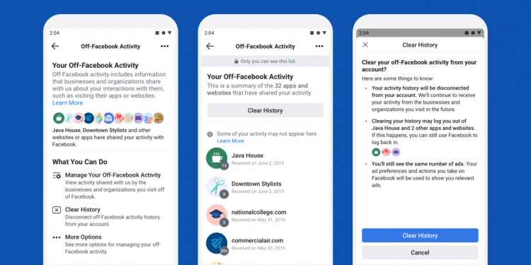تعمل ميزة مسح سجل التصفح (Off-Facebook Activity) في فيسبوك على مسح المعلومات التي جمعها فيسبوك عن نشاطك خارج التطبيق خلال الـ180 يومًا الماضية، والتي يحصل عليها فيسبوك من خلال شراكاته الإعلانية مع تطبيقات ومواقع الطرف الثالث، التي تخبر فيسبوك طوعًا بهويات الأشخاص الذين يزورونها.